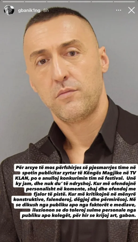 “Për shkak të mos përfshirjes sime në spotin publicitar zyrtar të ‘Këngës Magjike’ në TV Klan, po e tërheq pjesëmarrjen time nga ky festival,” – deklaroi ai publikisht.