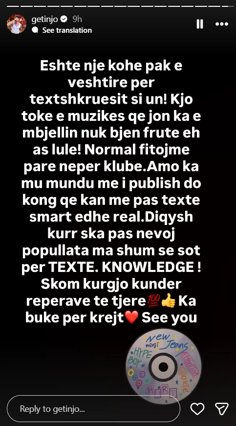 Reperi i njohur Getinjo ka ndarë një mesazh të sinqertë dhe reflektues në rrjetet sociale, duke folur për vështirësitë që përballen artistët që fokusohen në muzikë me përmbajtje dhe kuptim të thellë.