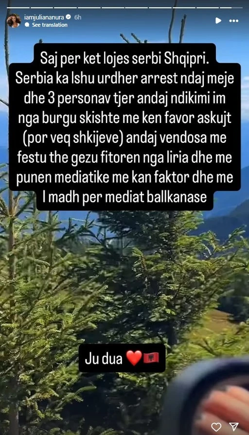 Ish-banorja e “Big Brother VIP Kosova”, Juliana Nura, ka shpërthyer në një reagim të fuqishëm pas ndeshjes Serbi–Shqipëri, duke zbuluar një detaj të bujshëm: autoritetet serbe kanë lëshuar urdhër arresti ndaj saj dhe tre personave të tjerë.